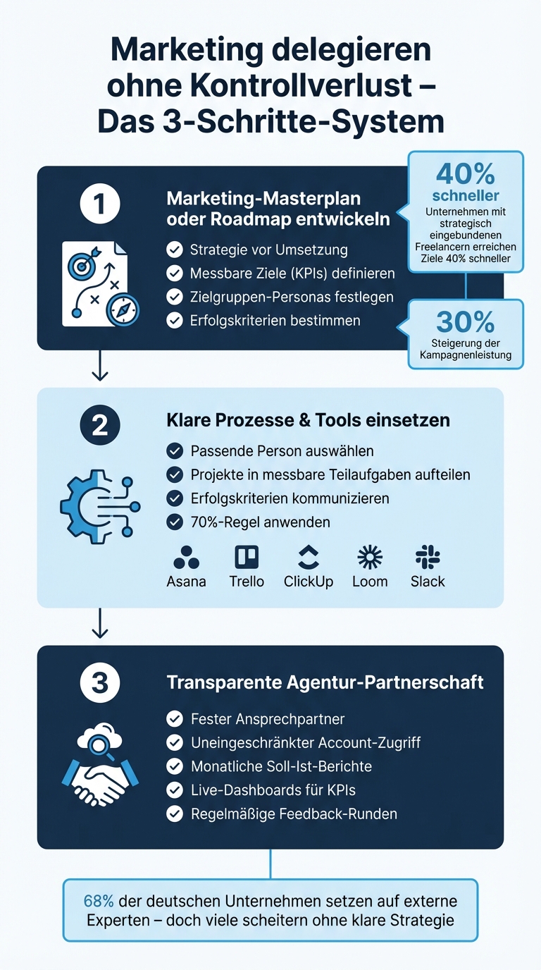 The foundation for successful delegation is clear preparation. A Marketing Master Plan or roadmap defines the "what" and "why" before execution begins. Without this strategic basis, entrepreneurs merely delegate tasks, not responsibility for results – a direct path into micromanagement.