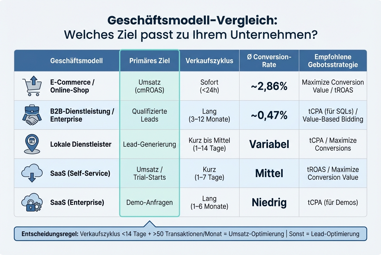 | Business model |** Primary goal** |** Sales cycle** |** Ø Conversion rate** |** Recommended bidding strategy** | | E-commerce / Online shop | Revenue (cmROAS) | Immediate (<24h) | ~2.86% | Maximize Conversion Value / tROAS | | B2B service / Enterprise | Qualified leads | Long (3-12 months) | ~0.47% | tCPA (for SQLs) / Value-Based Bidding | | Local service providers | Lead generation | Short to medium (1-14 days) | Variable | tCPA / Maximize Conversions | | SaaS (Self-service) | Revenue / Trial starts | Short (1-7 days) | Medium | tROAS / Maximize Conversion Value | | SaaS (Enterprise) | Demo requests | Long (1-6 months) | Low | tCPA (for demos) |
