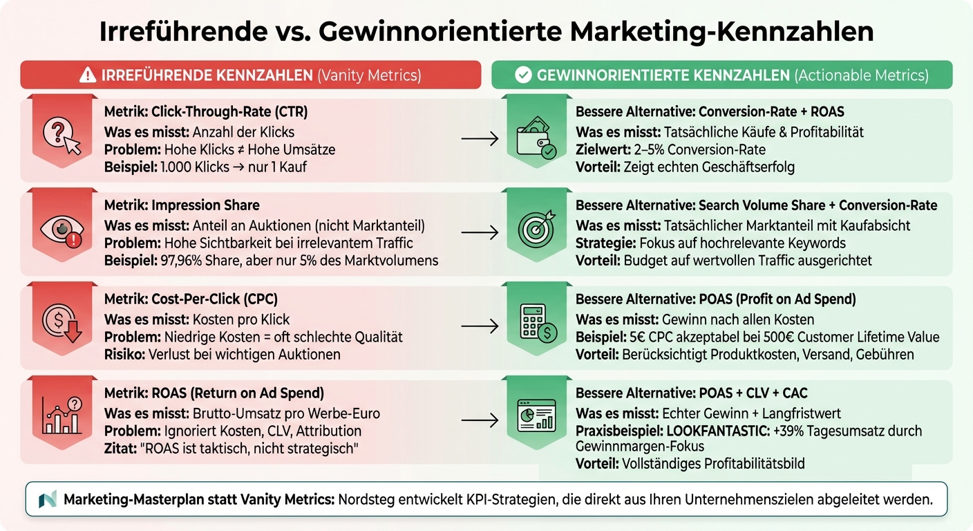 Without clear metrics your marketing stays directionless. And yet caution is in order: not every number that is measured delivers a solid basis for decisions. The core message of this article is: high click rates, low cost per click or impressive impression shares say nothing about whether your marketing is actually profitable.