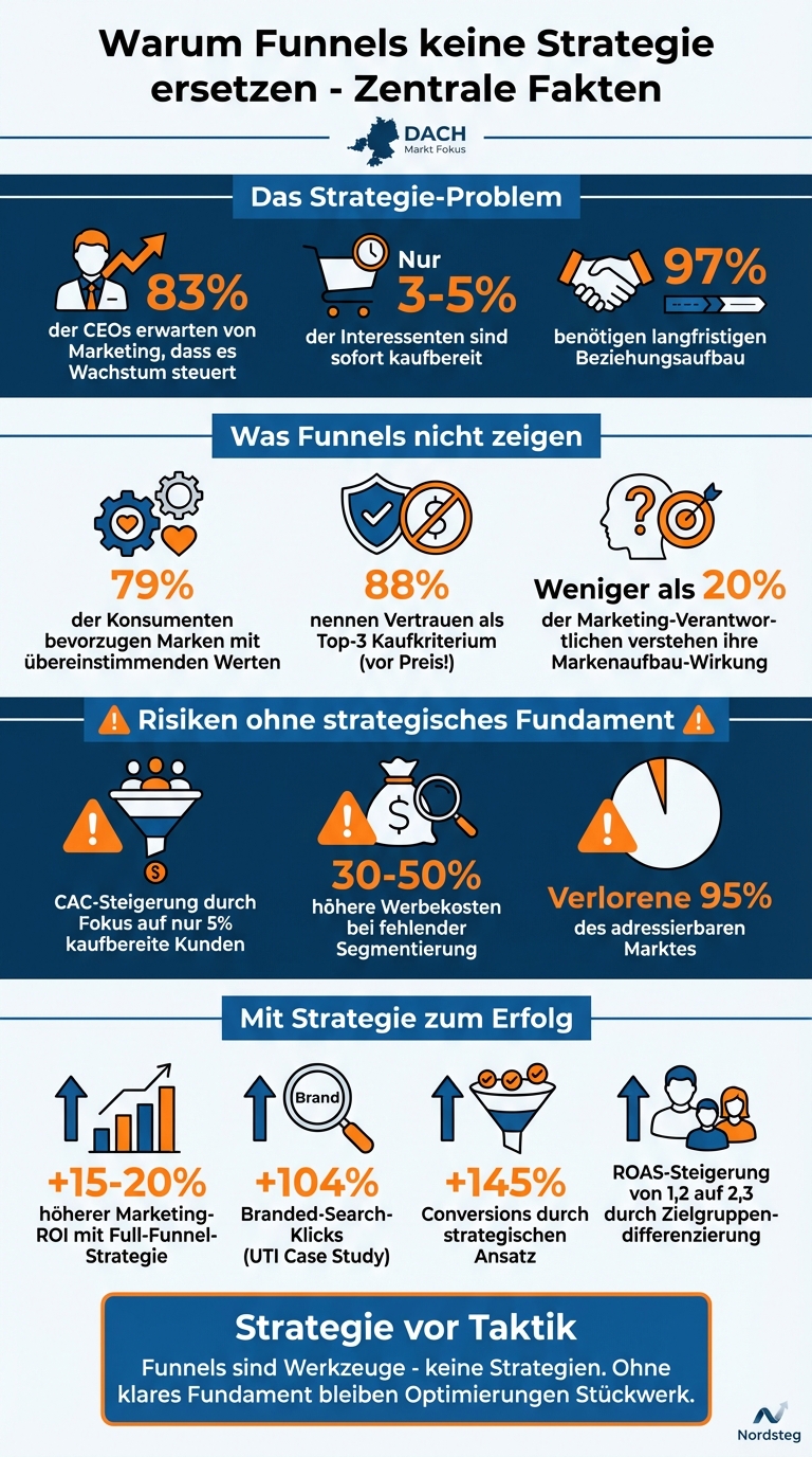 Funnels are no replacement for clear alignment. Anyone who relies exclusively on measurable results like clicks or conversions loses sight of the essentials: sustainable growth and clear market positioning. 83% of CEOs expect their marketing to drive growth – but funnels deliver no answers for this. Without a well-thought-out foundation, every optimisation remains piecework.