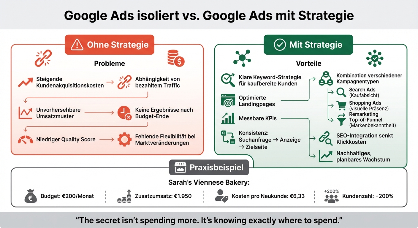 The difference between isolated Google Ads and strategically embedded campaigns shows clearly: without a plan they often only cause costs, while with a system they become a multiplier for your success. A strategic embedding is therefore indispensable.