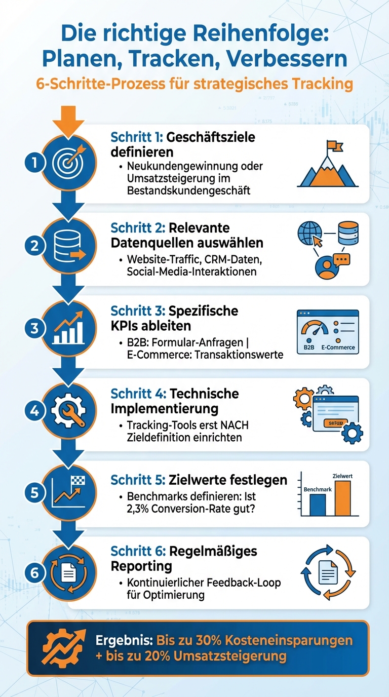 A structured 6-step process ensures that tracking and strategy go hand in hand. Start with the definition of your business goals – for example new customer acquisition or a revenue increase in existing customer business. Then choose the relevant data sources, such as website traffic, CRM data or social media interactions. From this data you derive specific KPIs that fit your business model – for example form enquiries for B2B companies or transaction values for online shops.